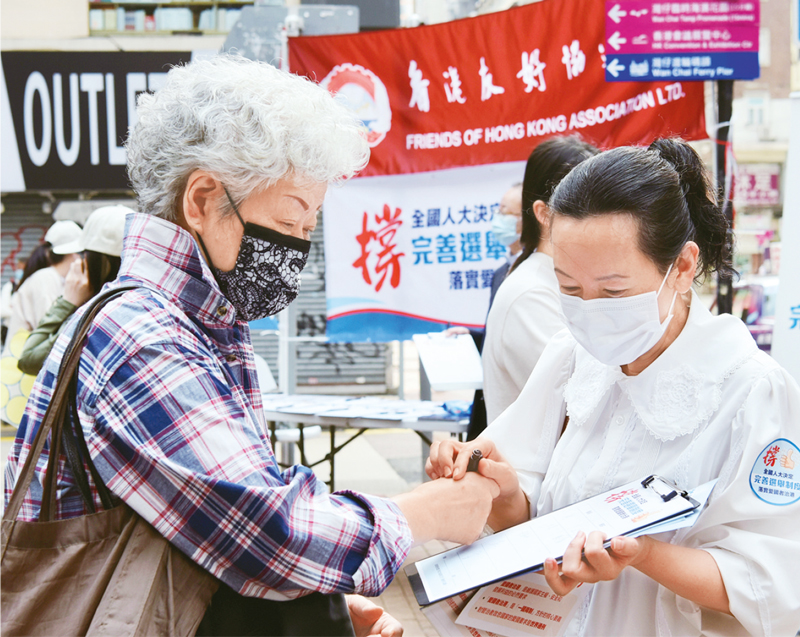 2021年3月12日,香港市民到灣仔街站簽名支持完善香港選舉制度,落實“愛國者治港”?!≈行律缬浾?李志華/攝