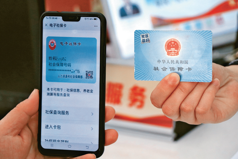 數(shù)字化發(fā)展從根本上改變了傳統(tǒng)的生產(chǎn)方式、商業(yè)模式和生活方式,社??ㄒ灿瓉硇碌摹白兩怼薄k娮由绫?ㄗ鳛樯绫?ň€上應(yīng)用的有效電子憑證,與實(shí)體社保卡一一對應(yīng),并實(shí)現(xiàn)全國通用,具有身份憑證、信息記錄、自助查詢、醫(yī)保結(jié)算、繳費(fèi)及待遇領(lǐng)取等功能。圖為2020年12月17日,北京市西城區(qū)天橋街道政務(wù)服務(wù)中心,工作人員幫助居民完成電子社??せ睢!≈行律缬浾?牛云崗/攝