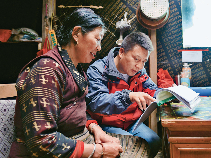 黨的十八大以來,圍繞全民覆蓋、人人享有社會保障的目標(biāo),我國通過實(shí)施全民參保計(jì)劃,精準(zhǔn)推進(jìn)重點(diǎn)群體參保,建立了世界上覆蓋人數(shù)最多的社會保障體系。圖為2018年5月24日,西藏山南市社保工作人員在玉麥鄉(xiāng)玉麥村村民家中,進(jìn)行社保信息補(bǔ)充登記?!⌒氯A社記者 晉美多吉/攝