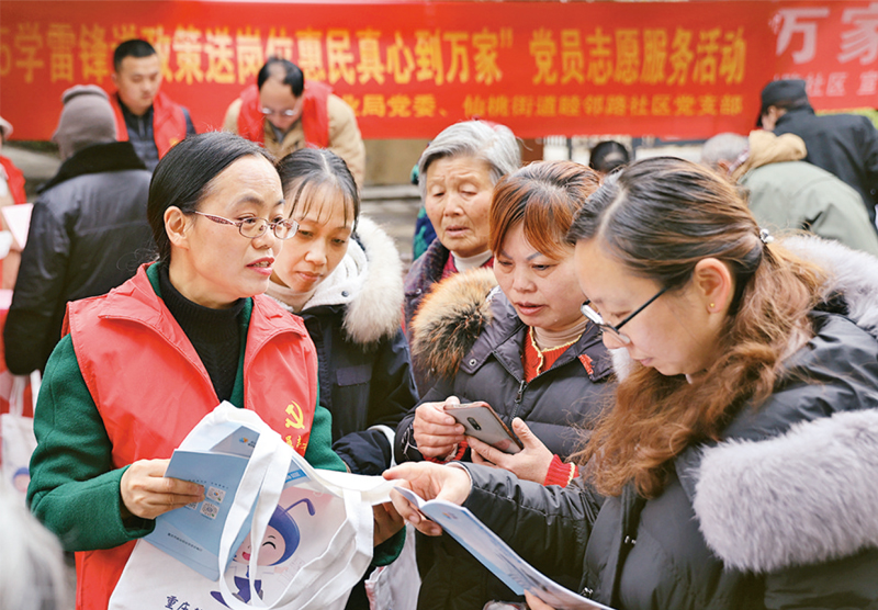 公共服務(wù)是落實(shí)社會保障政策的重要載體,必須堅(jiān)持貼近實(shí)際、貼近生活、貼近群眾,聚焦重點(diǎn)政策,突出精細(xì)化、精準(zhǔn)化宣傳,把社會保障政策向基層、向大眾講清講透。圖為2021年3月5日,重慶市人社局黨員志愿者深入渝北仙桃社區(qū),現(xiàn)場為群眾講解有關(guān)政策?!∪肆Y源社會保障部供圖