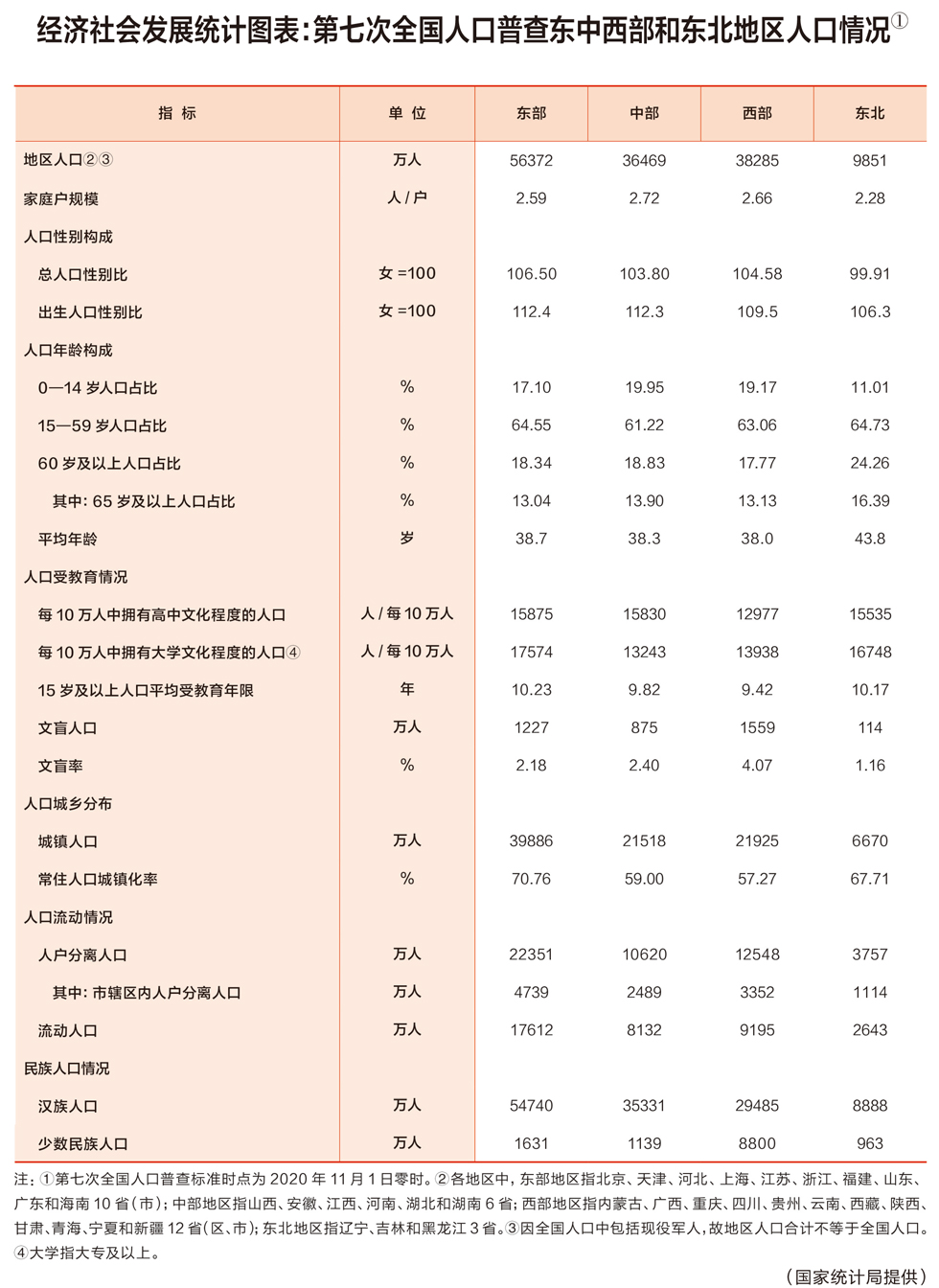 經(jīng)濟(jì)社會(huì)發(fā)展統(tǒng)計(jì)圖表:第七次全國人口普查東中西部和東北地區(qū)人口情況