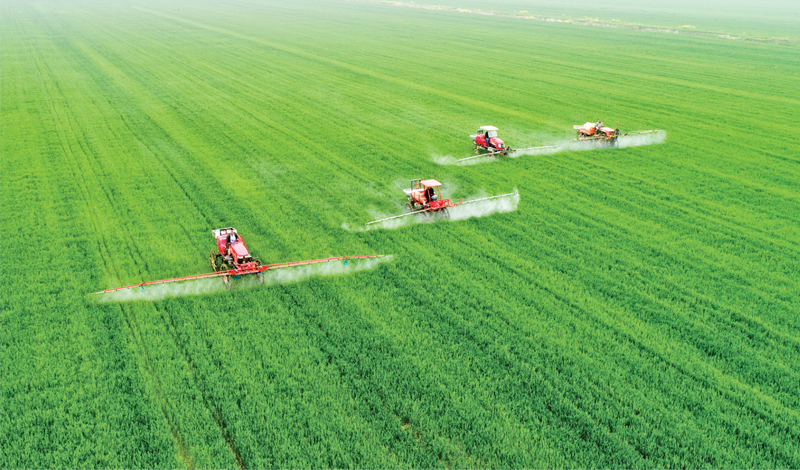 江蘇堅(jiān)持牢牢把飯碗端在自己手上,糧食年產(chǎn)量穩(wěn)定在700億斤以上。圖為農(nóng)歷二十四節(jié)氣中的谷雨,江蘇泗洪金鎖鎮(zhèn)萬畝小麥種植基地機(jī)聲隆隆,大型農(nóng)機(jī)在田野里穿梭,為小麥噴施農(nóng)藥?!〗K省委宣傳部供圖 張連華/攝