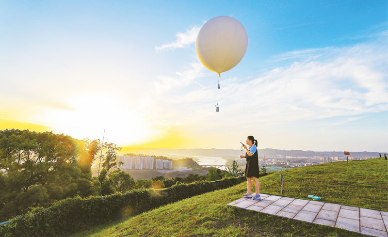 圖為2020年6月3日,氣象觀測員在四川省宜賓市氣象站釋放探空氣球。該氣象站位于當(dāng)?shù)厝嗽斐鞘猩止珗@翠屏山山頂,海拔502.8米。在這個環(huán)境優(yōu)美、空氣清新的氣象站里,氣象觀測員通過全面自動化地面氣象觀測系統(tǒng)記錄氣象情況并對收集到的數(shù)據(jù)處理傳回分析,第一時間通過短信將最新天氣預(yù)報(bào)發(fā)送至市民手機(jī),以便當(dāng)?shù)厝罕娂磿r安排工作與生活?!∪嗣駡D片 莊歌爾/攝