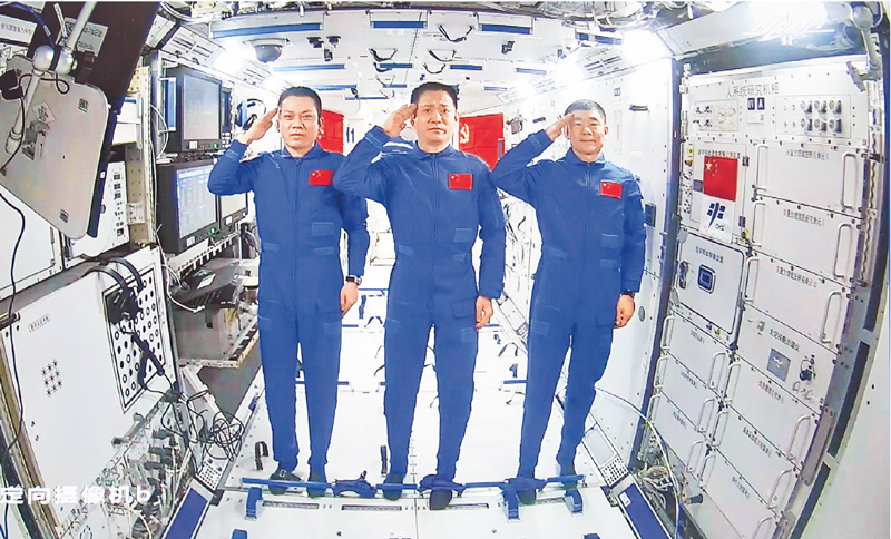 2021年6月17日,神舟十二號載人飛船成功發(fā)射升空,中國人首次進(jìn)入了自己的空間站。6月23日上午,習(xí)近平總書記來到北京航天飛行控制中心,同正在天和核心艙執(zhí)行任務(wù)的神舟十二號航天員聶海勝、劉伯明、湯洪波親切通話。圖為3名航天員精神飽滿,向總書記敬禮。 新華社記者 岳月偉/攝