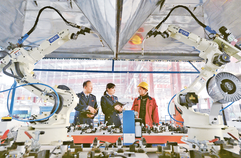 近年來,邯鄲市肥鄉(xiāng)區(qū)稅務(wù)局實施“一企一策”個性化精準輔導,主動上門宣傳和解讀減稅降費政策,確保稅費優(yōu)惠相關(guān)政策落實“一戶不少、應(yīng)享盡享”,為企業(yè)發(fā)展助力。圖為2020年10月29日,邯鄲市肥鄉(xiāng)區(qū)稅務(wù)局工作人員在一家生產(chǎn)企業(yè)調(diào)研稅費政策落實情況。 新華社記者 王曉/攝
