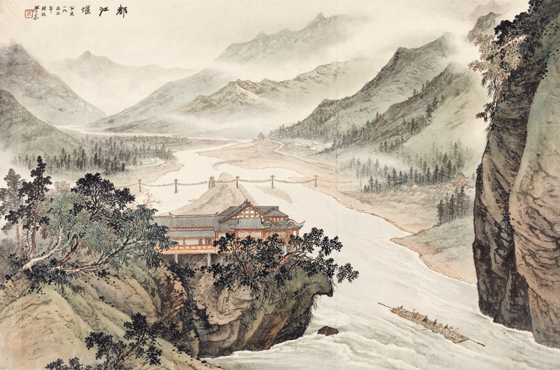 以治水為例,面對自然災害,中國古代先民從鯀的“堵”水削峰到禹的“導”江分流,再到李冰父子的“引”水灌溉,直至如今“高峽出平湖”建設壯舉,勤勞勇敢、自強不息的偉大民族精神薪火相繼,代代相傳。岑學恭的山水畫作《灌縣都江堰》,以中華兒女發(fā)揮聰明才智努力改造自然,最終造就了都江堰這一“滿城水色半城山”的人間壯舉為題材,用實地寫生的方法與中國傳統(tǒng)山水畫法結合,既描寫了中國古代治水的科學傳奇佳話,又用新山水筆墨歌頌新中國的美麗河山,成為新中國美術史上山水藝術探索中的一件重要作品。畫面選取都江堰中尋常的一景,畫筆下湍急江流中奮力前行的排筏,生動詮釋著中華民族“天行健,君子以自強不息”的偉岸精神風范,讓人們深刻感知到時代進程中一代又一代勞動人民不畏艱險,戰(zhàn)天斗地,為美好生活奮斗的歷史過程?!豆嗫h都江堰》體現出的美學內涵,不僅是對中華兒女巧奪天工勞動智慧的無比贊美,更是對自強不息民族精神的高度弘揚。