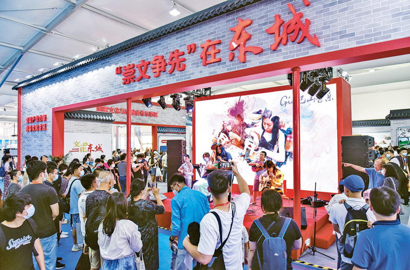 圖為中國國際服務(wù)貿(mào)易交易會文化服務(wù)專題展東城展區(qū)?!俺缥臓幭取笔菛|城的參展主題,詮釋了東城區(qū)發(fā)揮文化優(yōu)勢,以“爭先”的態(tài)度,努力建設(shè)“國際一流的和諧宜居之都”首善之區(qū)。 北京市東城區(qū)委宣傳部供圖 張傳東/攝