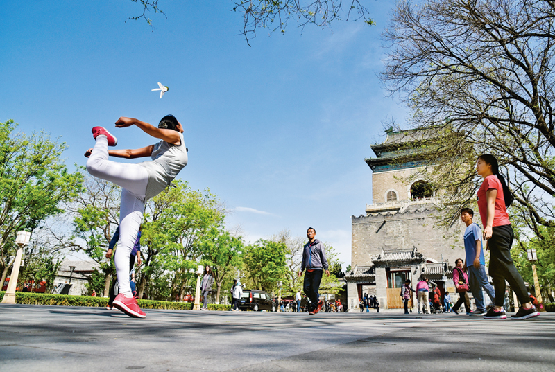 為了保護、傳承、利用好中軸線,東城區(qū)以中軸線申遺為契機,先后啟動實施了33處重點文物的騰退及風貌整治項目。通過保護騰退,中軸線重新熠熠生輝。圖為居民在鐘鼓樓廣場踢毽子。 北京市東城區(qū)委宣傳部供圖 張傳東/攝