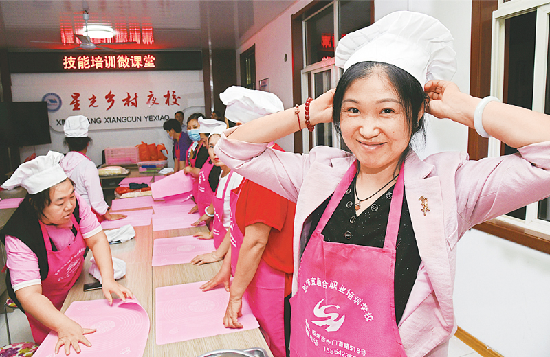 2021年以來,青島膠州市先后在24個鄉(xiāng)村(社區(qū))扶持打造了35個村級夜校,開設育嬰師、面點師、電焊工等“接地氣”的培訓課程,幫助村民豐富精神文化生活、提高創(chuàng)業(yè)致富技能水平。圖為2021年8月31日,村民在夜校學習中式面點制作?!⌒氯A社記者 李紫恒/攝