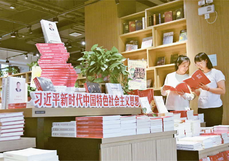 黨確立習近平同志黨中央的核心、全黨的核心地位,確立習近平新時代中國特色社會主義思想的指導地位,反映了全黨全軍全國各族人民共同心愿,對新時代黨和國家事業(yè)發(fā)展、對推進中華民族偉大復興歷史進程具有決定性意義。圖為2021年10月4日,河南省焦作市博愛縣新華書店里,讀者在閱讀習近平新時代中國特色社會主義思想相關書籍?!≈行律绨l(fā) 程全/攝