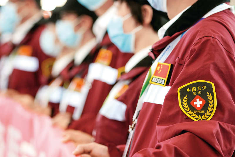 應(yīng)阿爾及利亞政府邀請,中國政府赴阿爾及利亞抗疫醫(yī)療專家組赴阿幫助開展疫情防控工作。圖為2020年5月13日,在重慶江北國際機(jī)場,重慶市選派專家在送行儀式上。 新華社記者 劉潺/攝