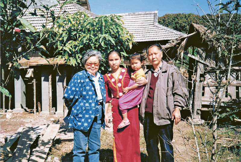 1983年,李桓英來到云南省勐臘縣南醒村,建立“短程聯(lián)合化療”試點。經(jīng)過27個月的治療,服藥的47名患者臨床癥狀全部消失,完全達到了預(yù)期效果。1990年4月,當(dāng)?shù)卣e行了麻風(fēng)寨摘帽更名大會,南醒村有了一個全新的名字——曼喃醒村,在傣語中意為“新生的山寨”。圖為1994年11月,李桓英(左一)在當(dāng)?shù)毓ぷ魅藛T(右一)的陪同下回到曼喃醒村追蹤監(jiān)測,與治愈的麻風(fēng)病患者及其生育的健康后代合影?!”本┦形麄鞑抗﹫D