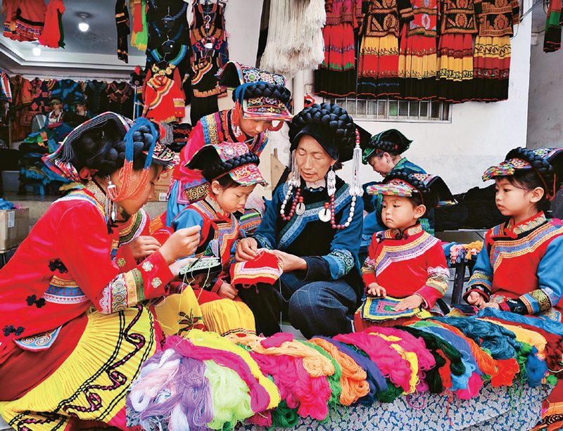 2020年4月15日,在四川省涼山彝族自治州甘洛縣,國家級(jí)非遺彝繡技藝傳承人阿西巫之莫在給小朋友講授彝族刺繡技藝。 甘洛縣融媒體中心記者 宋奀/攝