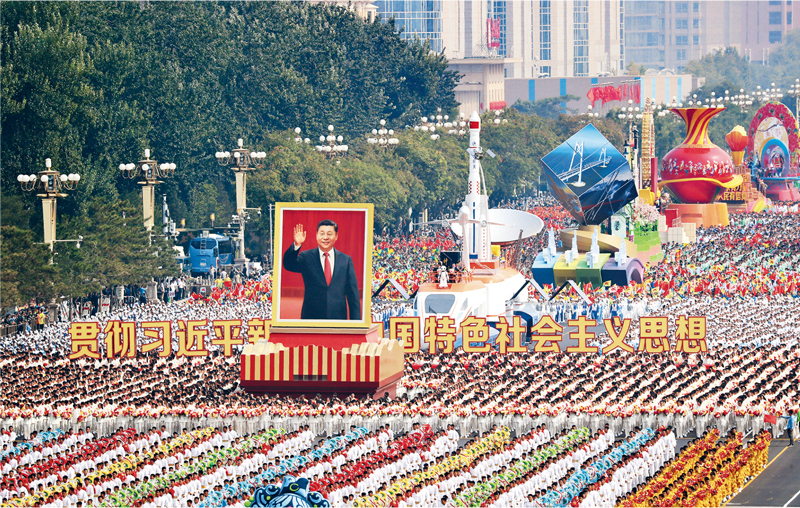 習(xí)近平新時代中國特色社會主義思想是當(dāng)代中國馬克思主義、二十一世紀(jì)馬克思主義,是中華文化和中國精神的時代精華,實現(xiàn)了馬克思主義中國化新的飛躍。圖為2019年10月1日,慶祝中華人民共和國成立70周年大會群眾游行中的“偉大復(fù)興”方陣。 新華社記者 琚振華/攝