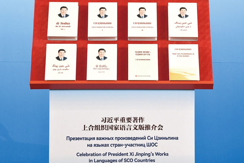 圖為2021年11月17日,習(xí)近平重要著作上合組織國家語言文版推介會在北京舉行,《習(xí)近平談治國理政》第一卷印地文、普什圖文、達(dá)里文、僧伽羅文、烏茲別克文,第二卷烏茲別克文和《之江新語》《習(xí)近平談“一帶一路”》俄文版等8種新書在推介會首發(fā)。 新華社記者 李賀/攝