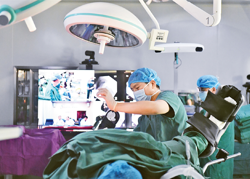 數(shù)字技術(shù)與醫(yī)療、農(nóng)業(yè)、能源、建筑、服務(wù)業(yè)等緊密結(jié)合,正在推動(dòng)傳統(tǒng)產(chǎn)業(yè)日益高端化、智能化。圖為2021年4月19日,拉薩市人民醫(yī)院骨科醫(yī)生在北京積水潭醫(yī)院專家遠(yuǎn)程指導(dǎo)下,使用骨科機(jī)器人開(kāi)展骨科手術(shù)?!⌒氯A社記者 孫瑞博 /攝