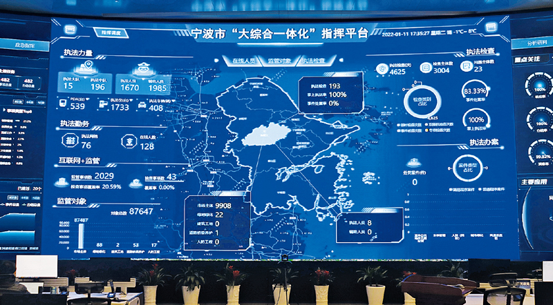 為解決一些地方存在的多頭執(zhí)法、重復執(zhí)法等問題,根據(jù)黨的十九屆三中全會審議通過的《中共中央關(guān)于深化黨和國家機構(gòu)改革的決定》,各地積極開展跨領(lǐng)域跨部門綜合行政執(zhí)法體制改革。圖為2022年1月11日拍攝的浙江省寧波市“大綜合一體化”指揮平臺?!≈醒霗C構(gòu)編制委員會辦公室供圖