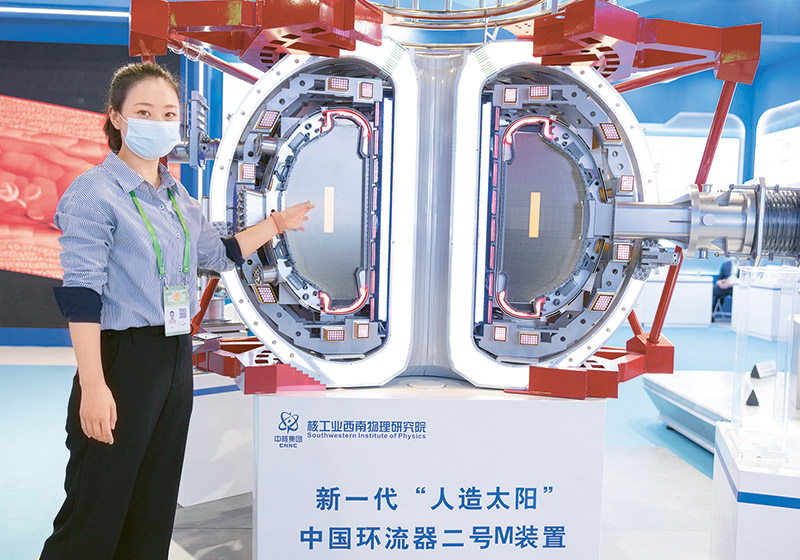 科技創(chuàng)新為高質(zhì)量發(fā)展注入強(qiáng)勁動(dòng)能,助力創(chuàng)新型國家建設(shè)新征程。圖為2021年10月21日,在北京展覽館舉行的國家“十三五”科技創(chuàng)新成就展上,工作人員介紹新一代“人造太陽”中國環(huán)流器二號M裝置。中國環(huán)流器二號M裝置是我國目前規(guī)模最大、參數(shù)最高的新一代先進(jìn)磁約束核聚變實(shí)驗(yàn)研究裝置,等離子體離子溫度可達(dá)到1.5億攝氏度,是實(shí)現(xiàn)我國核聚變能開發(fā)事業(yè)跨越式發(fā)展的重要依托裝置?!⌒氯A社記者 才揚(yáng)/攝