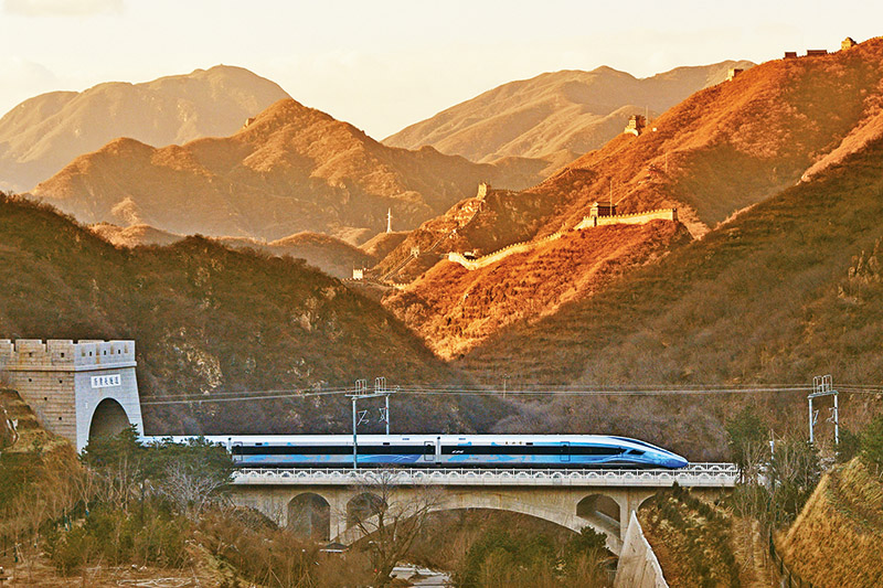 高鐵是交通運輸現(xiàn)代化的重要標志,也是一個國家工業(yè)化水平的重要體現(xiàn)。1909年,京張鐵路建成;2019年,京張高鐵通車。從自主設計修建零的突破到世界最先進水平,從時速35公里到350公里,京張線見證了中國鐵路的發(fā)展,也見證了中國綜合國力的飛躍。作為我國首條建成投用的智能高鐵,京張高鐵也是北京冬奧會的重要配套工程。圖為2022年1月10日,北京冬奧列車在京張高鐵居庸關長城附近運行?!×_春曉/攝