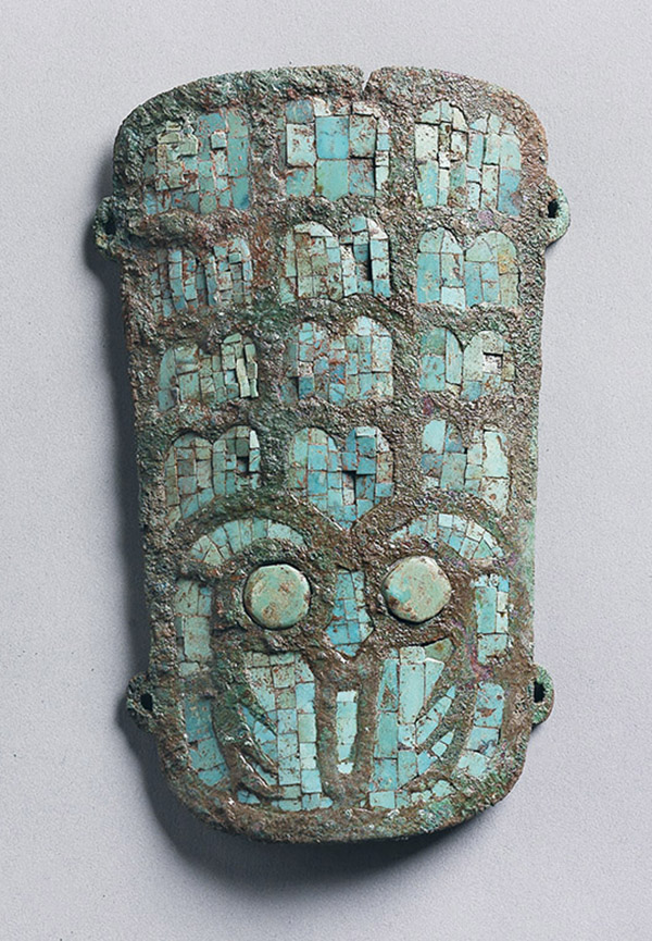 二里頭遺址,全國重點文物保護單位,中華文明探源工程首批重點六大都邑之一。遺址位于河南省洛陽市偃師區(qū)西南9公里外的伊洛河故道北沿(今洛河之南),其年代約為距今3800~3500年。二里頭遺址是探索中國早期文明和國家起源,研究夏文化、夏商王朝紀年及其分界的關(guān)鍵性遺址。圖為二里頭文化鑲嵌綠松石獸面紋青銅牌飾,牌飾的獸面紋開創(chuàng)了后代商周青銅器獸面紋母題的先河?!椅奈锞止﹫D
