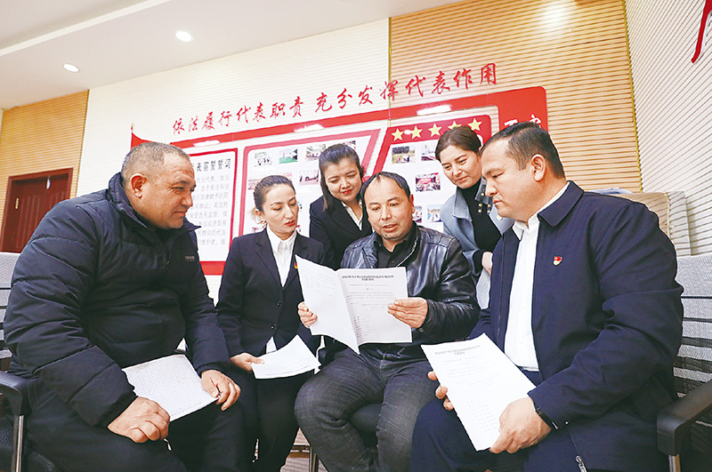 近年來(lái),新疆維吾爾自治區(qū)人大加強(qiáng)地方立法,為新疆社會(huì)穩(wěn)定和長(zhǎng)治久安提供法律保障。圖為2022年2月17日,自治區(qū)人大代表與喀什疏附縣縣鄉(xiāng)兩級(jí)人大代表在疏附縣人大代表工作室共同學(xué)習(xí)《新疆維吾爾自治區(qū)民族團(tuán)結(jié)進(jìn)步模范區(qū)創(chuàng)建條例》。 新疆維吾爾自治區(qū)人大常委會(huì)供圖