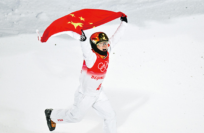 圖為2022年2月16日,中國(guó)選手齊廣璞慶祝奪冠。當(dāng)日,北京2022年冬奧會(huì)自由式滑雪男子空中技巧決賽在張家口賽區(qū)舉行,中國(guó)選手齊廣璞獲得冠軍。 新華社記者 肖藝九/攝