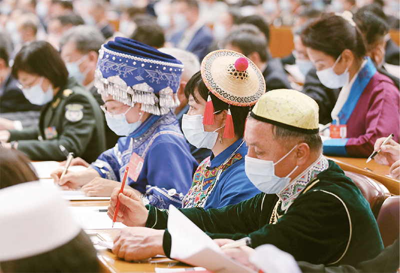 2022年3月4日,中國人民政治協(xié)商會議第十三屆全國委員會第五次會議在北京人民大會堂開幕。圖為委員們在認真聽會?!⌒氯A社記者 殷剛/攝