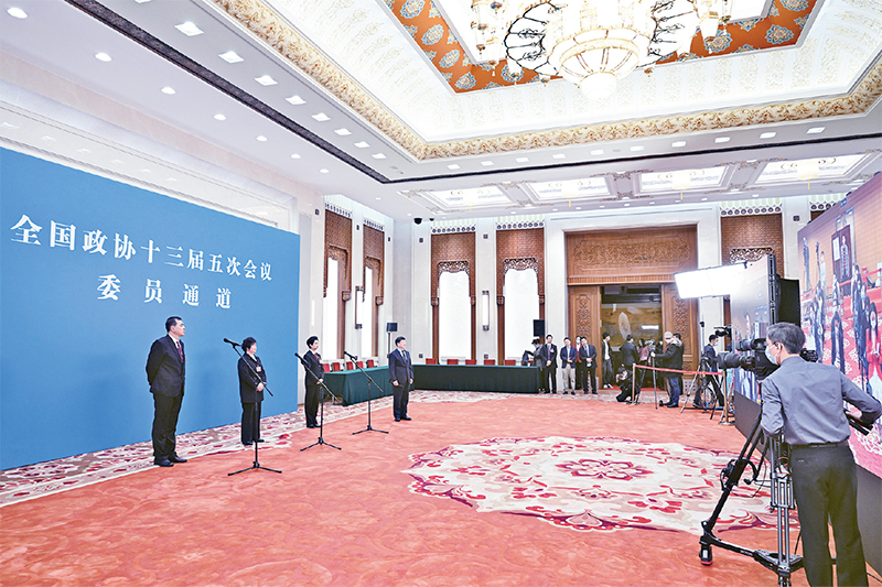 2022年3月4日,全國政協(xié)十三屆五次會議第一場“委員通道”采訪活動在北京人民大會堂新聞發(fā)布廳舉行。圖為政協(xié)委員通過網(wǎng)絡視頻方式接受媒體采訪?!?/font>新華社記者 金良快/攝