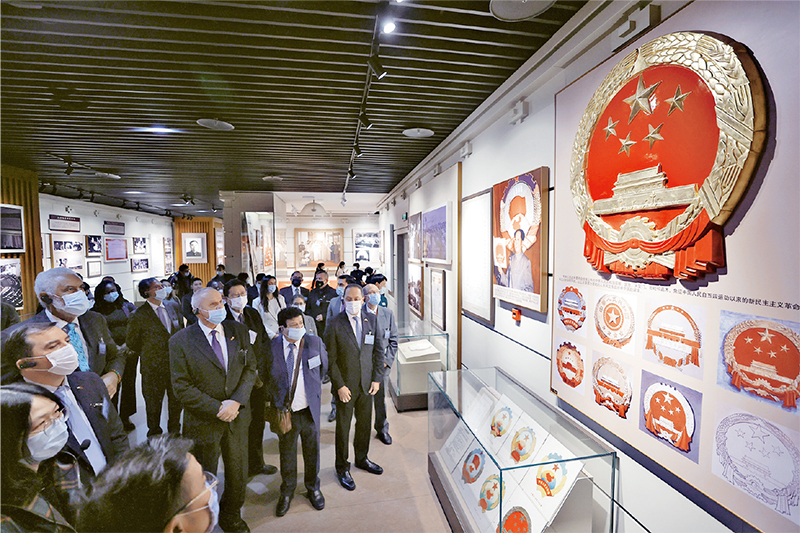 2021年10月21日,來自23個拉美和加勒比國家的駐華使節(jié)和外交官來到全國政協(xié)機關,參加“拉美和加勒比國家駐華使節(jié)進政協(xié)”活動。圖為他們參觀“人民政協(xié)光輝歷程”展覽?!≈行律缬浾?富田/攝