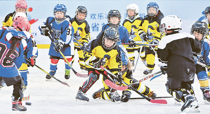圖為河北首屆冰雪運動會上,孩子們在配備先進制冷設(shè)備的真冰場上進行冰球比賽?!『颖比請笊?趙海江/攝