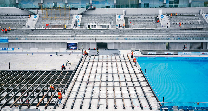 從“水立方”到“冰立方”,關(guān)鍵是要解決“水冰轉(zhuǎn)換”難題。轉(zhuǎn)換過程需經(jīng)多道工序,主要是把泳池中的水抽干,在底部搭建可轉(zhuǎn)換結(jié)構(gòu),安裝可拆裝制冰系統(tǒng),將水面冰化,鋪設(shè)國際標(biāo)準(zhǔn)的冰壺賽道。其中,搭建轉(zhuǎn)換結(jié)構(gòu)是首要難題,也是世界級難題。轉(zhuǎn)換結(jié)構(gòu)必須輕便,能夠快拆快裝,同時還要保證強(qiáng)度。攻關(guān)團(tuán)隊(duì)不分晝夜,選擇不同的結(jié)構(gòu)體系,測試產(chǎn)生的變形程度,累計(jì)進(jìn)行了35次試驗(yàn),最終從5種組合材料中選擇了鋼結(jié)構(gòu)加輕質(zhì)混凝土預(yù)制板結(jié)構(gòu)體系。每平米加載1噸,轉(zhuǎn)換結(jié)構(gòu)僅產(chǎn)生1.5毫米變形,遠(yuǎn)低于控制標(biāo)準(zhǔn),有效確保冰面平整度。通過建筑信息模型(BIM)技術(shù)模擬和優(yōu)化構(gòu)件排布,為2600根薄壁鋼和1570塊輕質(zhì)混凝土預(yù)制板編輯數(shù)字身份,從而實(shí)現(xiàn)每個構(gòu)件的精準(zhǔn)復(fù)位,以便在下次轉(zhuǎn)換過程中快速組裝搭建。