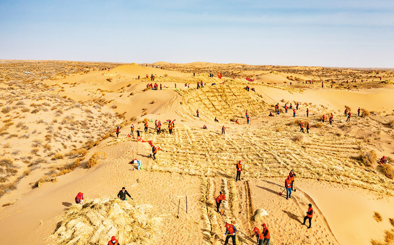 圖為2022年3月甘肅省古浪縣干部群眾義務(wù)壓沙的火熱場景。 古浪縣融媒體中心供圖