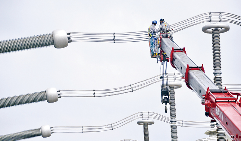采取國產(chǎn)核心技術(shù)和關(guān)鍵設(shè)備的張北柔性直流電網(wǎng)是目前國內(nèi)電壓等級最高的柔性直流電網(wǎng)。2022年北京冬奧會期間,作為綠色電能輸送主通道,確保了所有冬奧會場館使用上百分之百的綠色電能。圖為2021年9月25日,張北柔性直流電網(wǎng)延慶換流站員工在檢查輸變電設(shè)備。 新華社記者 李欣/攝