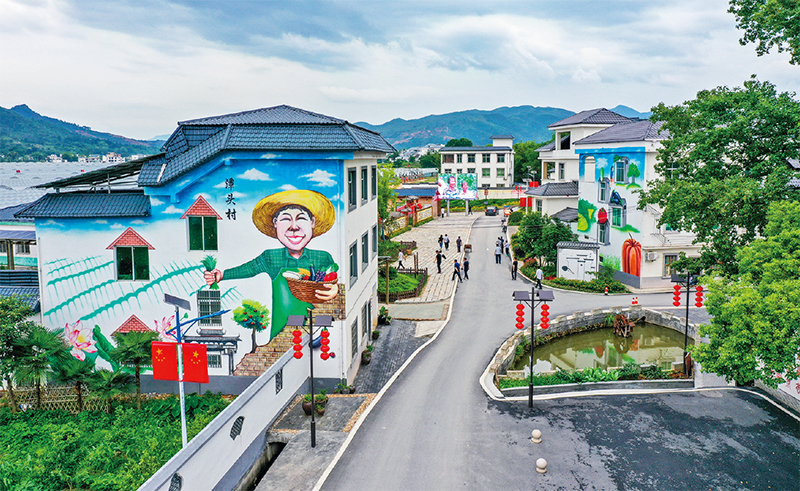 近年來(lái),潭頭村大力推動(dòng)鄉(xiāng)村振興,村容村貌、人居環(huán)境、精神文明建設(shè)呈現(xiàn)出嶄新氣象。圖為2021年5月12日,潭頭村農(nóng)居小樓墻上繪著喜慶的農(nóng)民畫(huà),充滿了生活的蓬勃活力與希望。 江西日?qǐng)?bào)社供圖 史港澤/攝