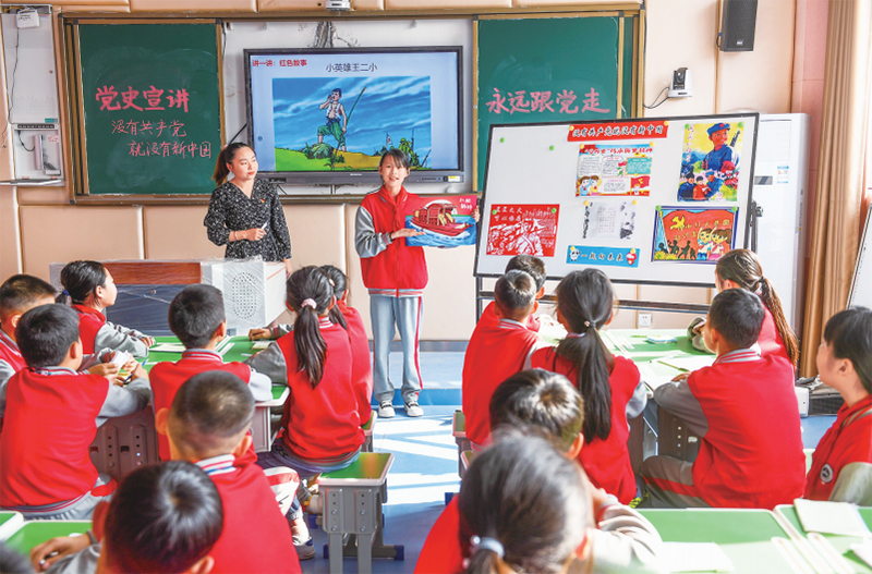 江西省宜春市宜豐縣各中小學(xué)校常態(tài)化開展黨史教育進校園主題活動。圖為2022年3月15日,宜豐縣橋西中心小學(xué)的學(xué)生在思政課上分享自己的黨史學(xué)習(xí)感悟。 人民圖片 周亮/攝