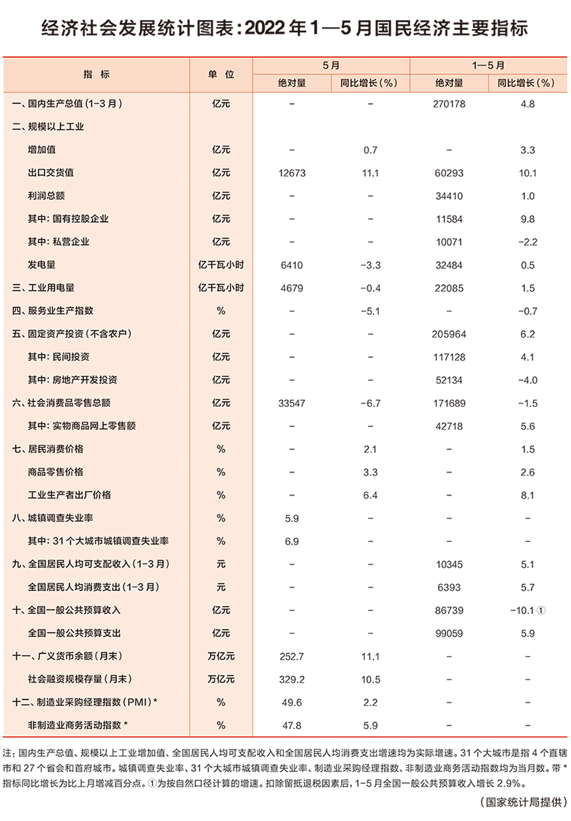 經(jīng)濟(jì)社會發(fā)展統(tǒng)計圖表:2022年1—5月國民經(jīng)濟(jì)主要指標(biāo)