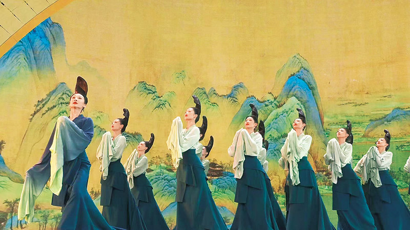 圖為圍繞傳世名作《千里江山圖》創(chuàng)排的舞蹈詩劇《只此青綠》亮相2022年中央廣播電視總臺春節(jié)聯(lián)歡晚會(視頻截圖)。 中央廣播電視總臺供圖