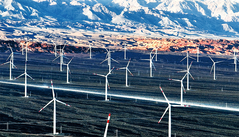 2022年5月21日,新疆生產(chǎn)建設(shè)兵團(tuán)六師北塔山牧場(chǎng)剛剛建成的風(fēng)力發(fā)電場(chǎng)風(fēng)機(jī)林立,一派壯觀的場(chǎng)面。 人民圖片 王志清/攝