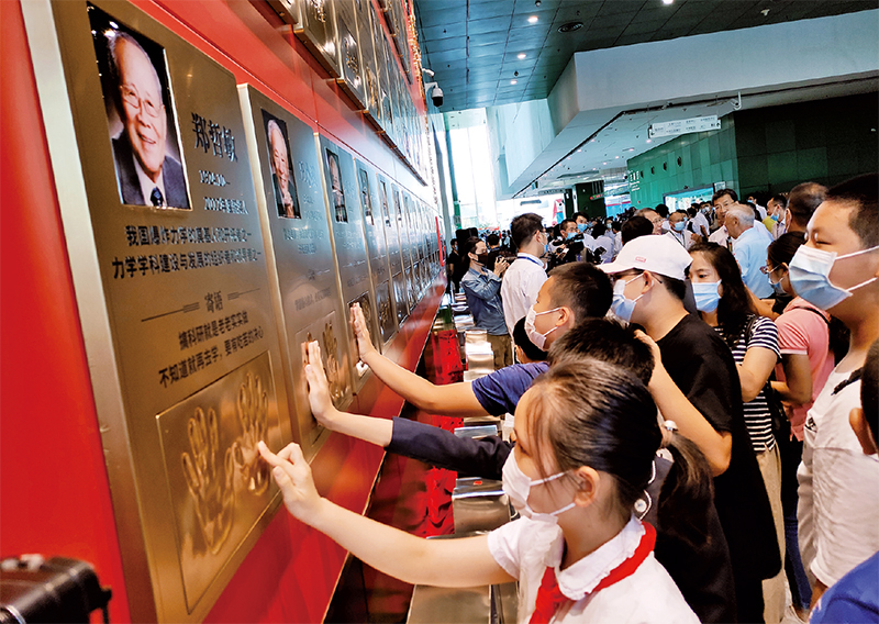2020年全國(guó)科普日期間,為弘揚(yáng)科學(xué)家精神,中國(guó)科技館與國(guó)家科學(xué)技術(shù)獎(jiǎng)勵(lì)工作辦公室共同實(shí)施“國(guó)家最高科學(xué)技術(shù)獎(jiǎng)獲獎(jiǎng)科學(xué)家手模”項(xiàng)目,采集袁隆平、孫家棟、屠呦呦、黃旭華等國(guó)家最高科學(xué)技術(shù)獎(jiǎng)獲獎(jiǎng)科學(xué)家手模,并錄制寄語(yǔ)視頻。2022年5月,中國(guó)科技館被中國(guó)科協(xié)、教育部、科技部等7部門認(rèn)定為全國(guó)首批“科學(xué)家精神教育基地”。圖為在科學(xué)家“手模墻”前,觀眾們品讀科學(xué)家寄語(yǔ)并與科學(xué)家“擊掌”。 中國(guó)科技館供圖