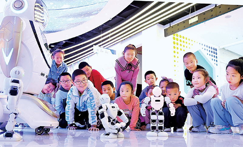 現(xiàn)代科技館體系服務(wù)范圍從城市居民為主拓展到全國(guó)城鄉(xiāng)居民、線上線下公眾,有效促進(jìn)了科學(xué)教育資源的均衡普惠。圖為2021年9月11日,甘肅省張掖市臨澤縣的小學(xué)生在張掖科技館觀看機(jī)器人表演。 求是圖片 王將/攝