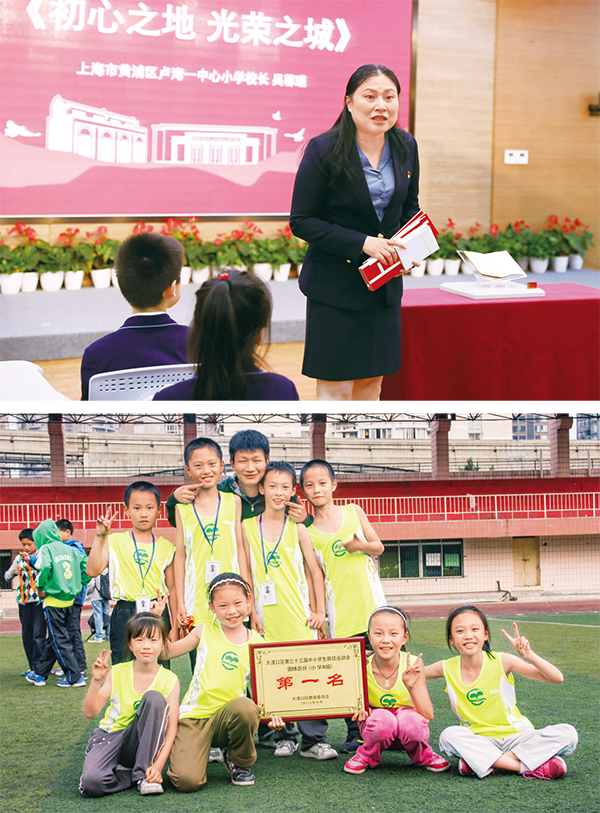 上圖為吳蓉瑾在主題班會上講述上海的紅色歷史(新華社記者 劉穎/攝);下圖為王紅旭在重慶大渡口區(qū)中小學生田徑運動會上和學生合影(新華社發(fā))。
