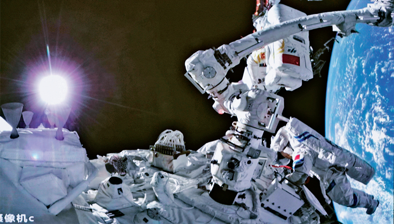 2022年9月17日17時(shí)47分,經(jīng)過約5小時(shí)的出艙活動(dòng),神舟十四號(hào)航天員陳冬、劉洋、蔡旭哲密切協(xié)同,完成出艙活動(dòng)期間全部既定任務(wù),航天員陳冬、蔡旭哲已安全返回問天實(shí)驗(yàn)艙,出艙活動(dòng)取得圓滿成功。圖為在北京航天飛行控制中心拍攝的航天員在艙外操作的畫面。 新華社記者 郭中正/攝