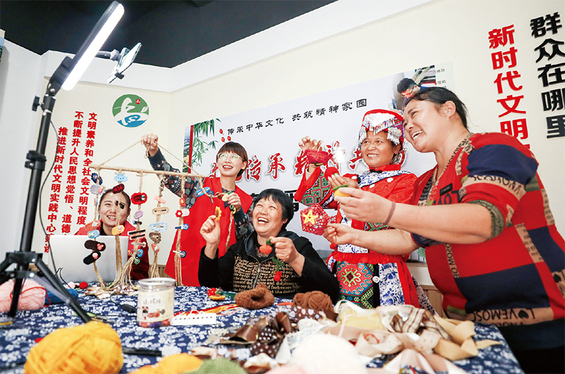 2021年10月27日,浙江省湖州市長(zhǎng)興縣虹星橋鎮(zhèn)畢家村在新時(shí)代文明實(shí)踐站開(kāi)展“文化傳承,精神共富”直播帶貨活動(dòng)。該村以“黨建+”的形式,帶領(lǐng)村民一起制作手工藝品,學(xué)習(xí)電商、直播等線上營(yíng)銷網(wǎng)絡(luò)新技能,提升村民就業(yè)技能,助力共同富裕。圖為青年黨員志愿者和村民一起直播帶貨?!∏笫菆D片 陸一平/攝
