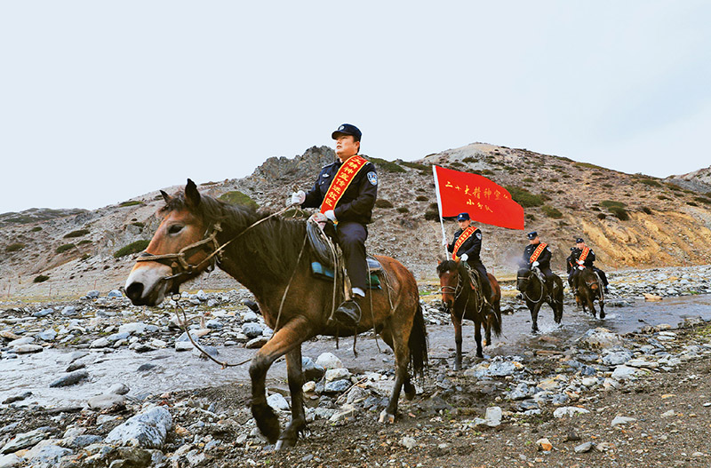 在新疆維吾爾自治區(qū)阿勒泰地區(qū),哈巴河邊境管理大隊(duì)成立“二十大精神宣傳小分隊(duì)”。圖為2022年10月27日,小分隊(duì)民警騎馬深入轄區(qū)與牧民共同學(xué)習(xí)黨的二十大精神?!∪嗣褚曈X(jué) 王友波/攝