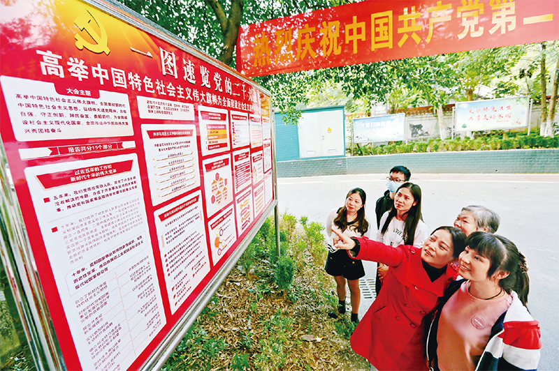 圖為2022年10月18日,重慶市萬盛經(jīng)開區(qū)東林街道清溪橋社區(qū),剛剛制作好的黨的二十大宣傳展板吸引了不少居民駐足閱覽,熱議并學(xué)習黨的二十大報告。 視覺中國 王瀘州/攝