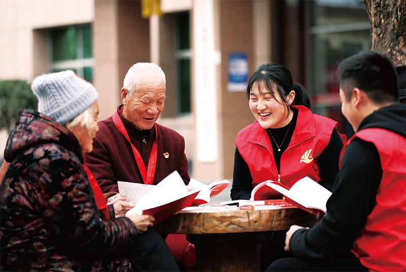 圖為2022年11月18日,山東省臨沂市郯城縣郯城街道“90后”青年黨員志愿者與龍泉社區(qū)“40后”老黨員一起學(xué)習黨的二十大精神。 人民圖片 張春雷/攝