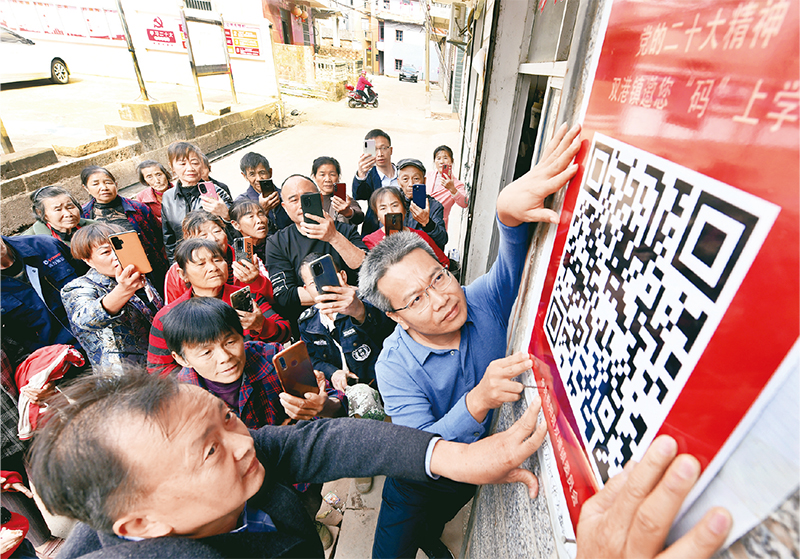 圖為2022年11月13日,江西省鄱陽縣雙港鎮(zhèn)黨員干部將宣講黨的二十大精神的二維碼貼在村頭,吸引不少村民前來掃碼學(xué)習了解有關(guān)知識。 中新社發(fā) 卓忠偉/攝