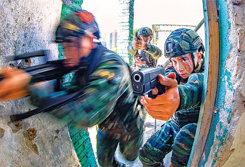 圖為2022年10月27日,武警廣西總隊(duì)北海支隊(duì)學(xué)習(xí)貫徹黨的二十大精神,掀起練兵備戰(zhàn)熱潮,組織特戰(zhàn)隊(duì)員開展綜合演練。 新華社發(fā) 梁承杰/攝
