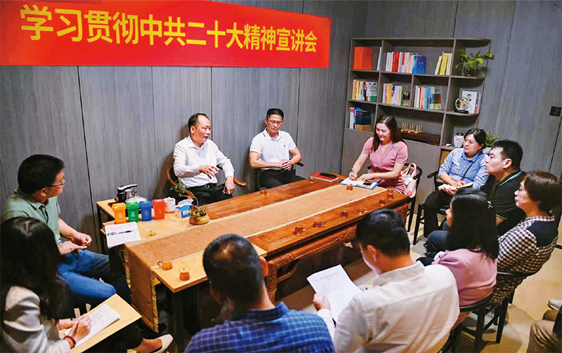 黨的二十大報告強調(diào)堅持貫徹新時代黨解決臺灣問題的總體方略,為做好新時代對臺工作提供了根本遵循和行動指南。圖為2022年11月16日臺盟福建省委會的宣講員在向盟員宣講中共二十大精神。 王鴻燕/攝
