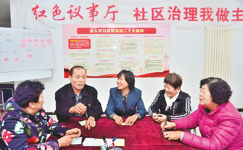 天津市河西區(qū)越秀路街道港云里社區(qū)深入學(xué)習(xí)貫徹黨的二十大精神,努力打造居民共建共治共享的基層治理新格局。圖為2022年11月23日,社區(qū)居民在“紅色議事廳”討論優(yōu)化社區(qū)治理事宜。 天津日?qǐng)?bào)記者 胡凌云/攝